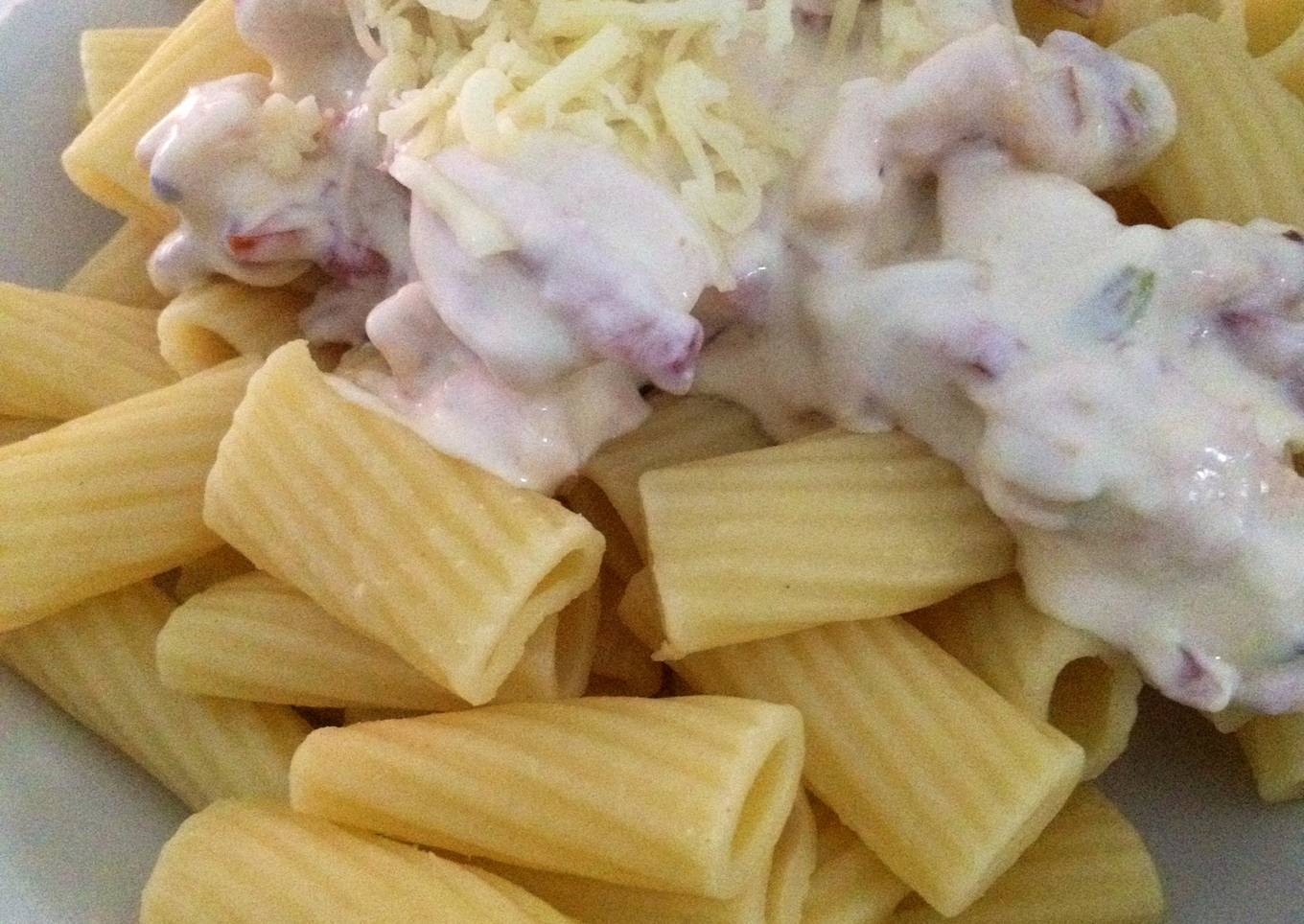 Macarrones con salsa blanca de pollo y bacon