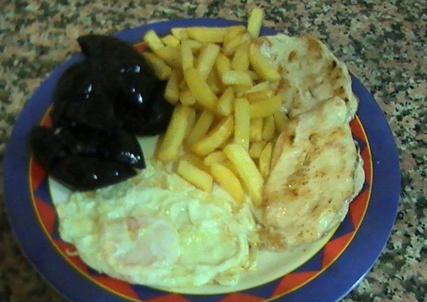 Un plato combinado con huevo frito, ñoras, pechuga y patatas fritas... Para chuparse los dedos. El sabor de la ñora es riquísimo.