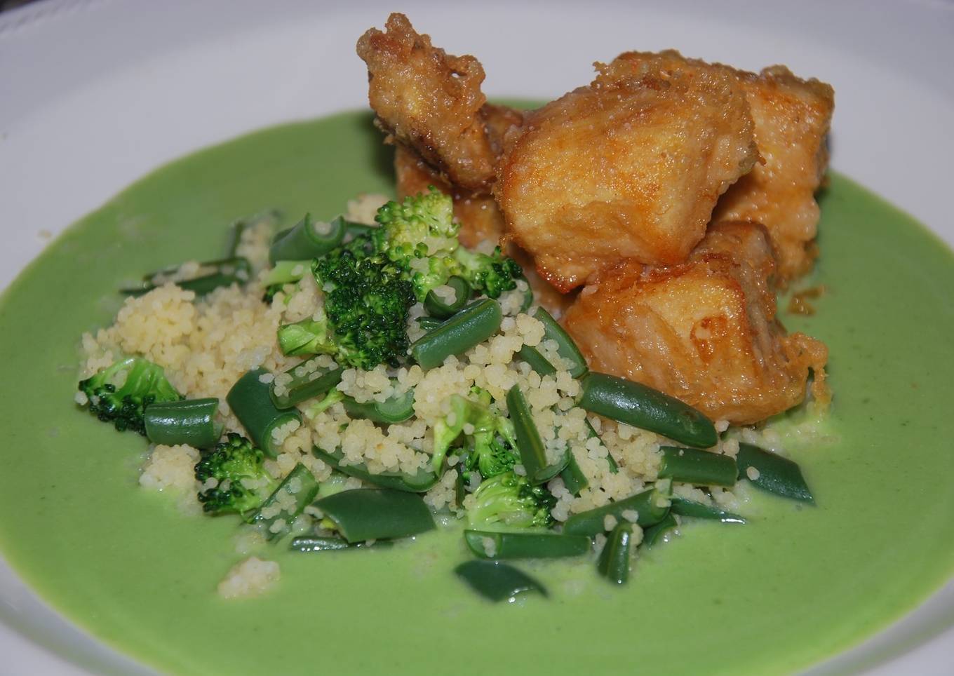 Mojar el plato con la crema de brócoli. Poner el pollo y al lado el cuscús.