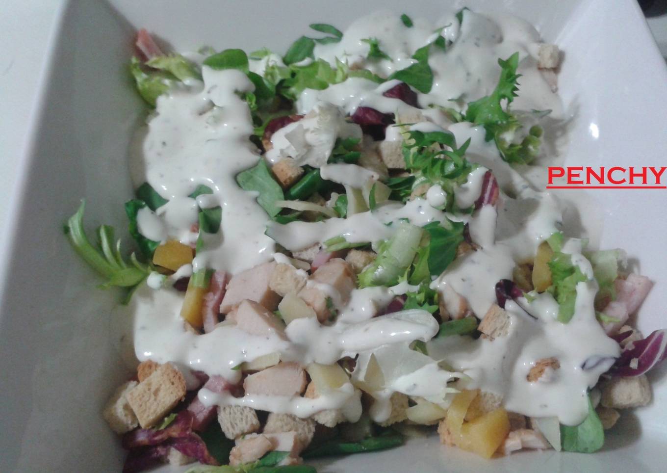 - Mezclamos y añadimos la salsa César en su superficie, mezclamos en el momento de servir.
