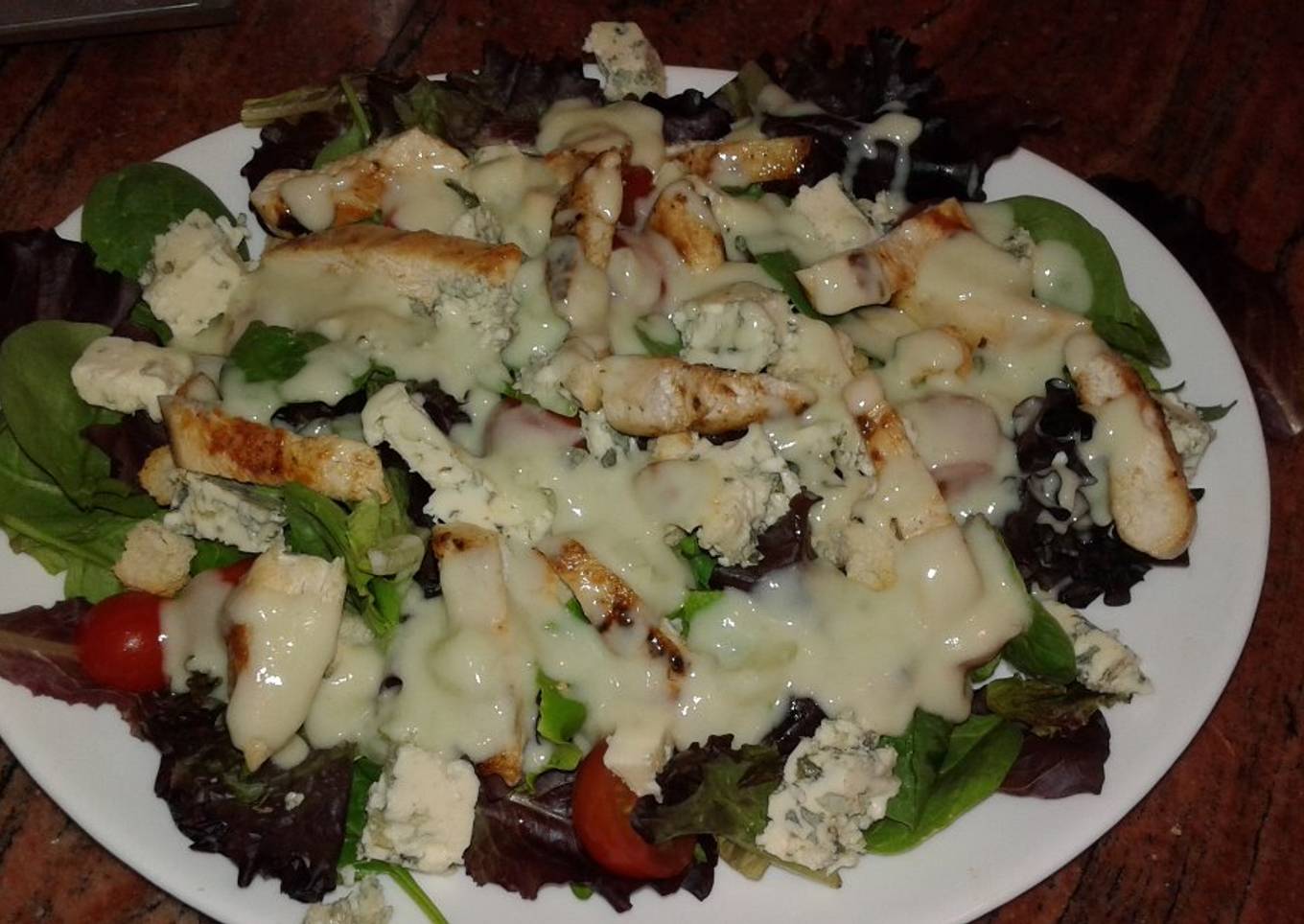 Ensalada templada de pollo y queso azul con salsa templada de roquefort