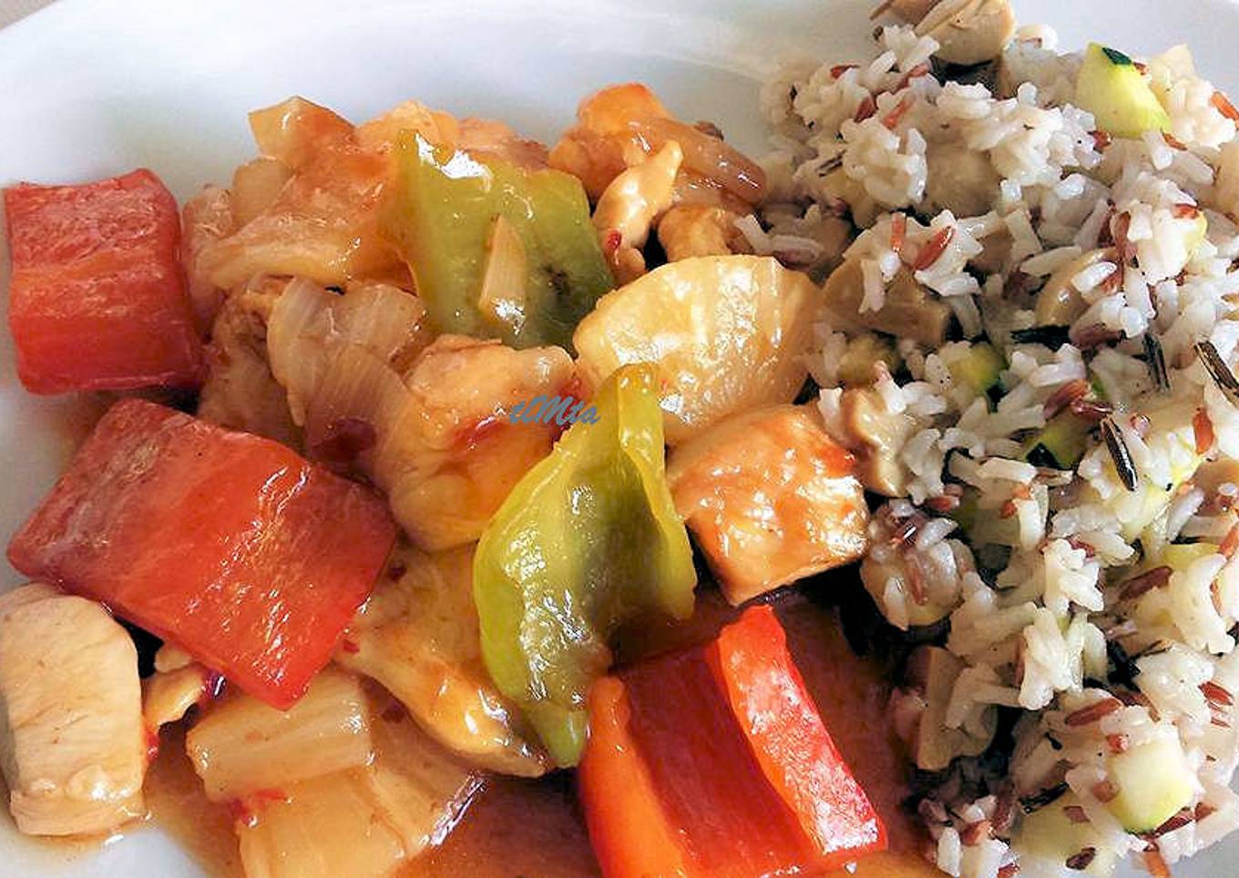 - Incorporar la cebolleta en trozos grandes y saltear. Cuando comienza a estar transparente incorporar los pimientos y seguir salteando. Cuando la verdura comience a "caer" añadir el pollo reservado, salpimentar y regar con el jugo de la piña. Dejar cocinar durante unos minutos. Añadir la salsa agridulce, mezclar bien y apagar el fuego. Incorporar la piña troceada mezclando bien con el resto de ingredientes y dejar reposar durante unos minutos.