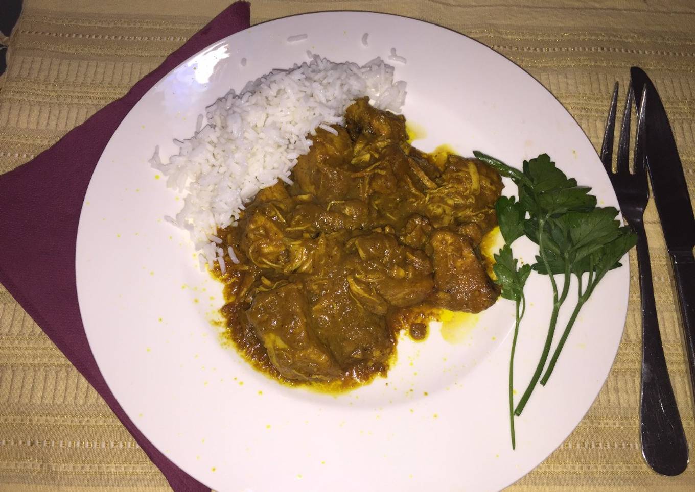 Autentica receta hindú de pollo al curry con leche de coco y manzanas. Se acompaña con arroz Basmati hervido.