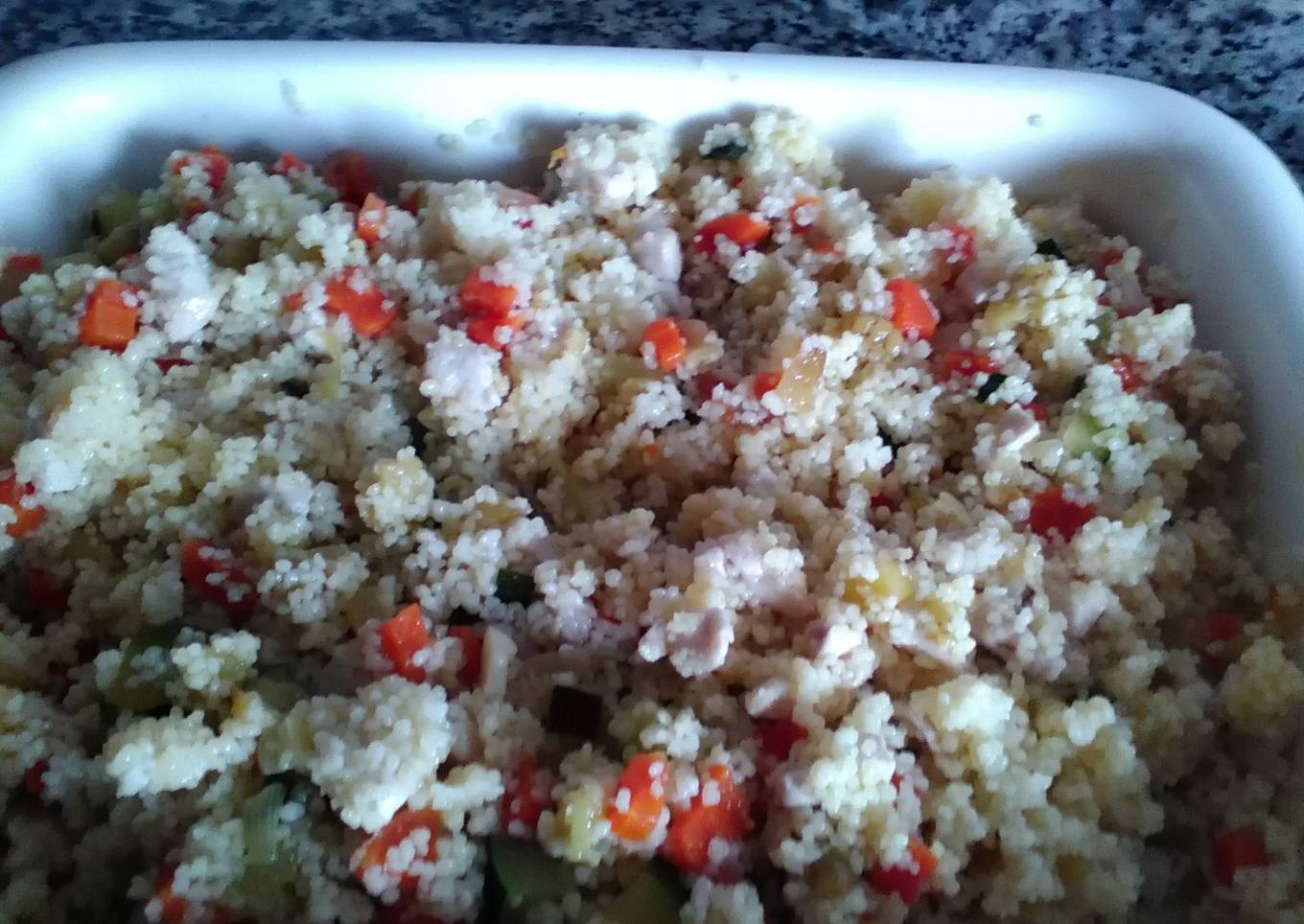 - Pon el cous-cous, ya hecho, en una fuente y agrega los daditos de pechuga con los ajos y el aceite que haya quedado en la sartén, agrega también las verduras rehogadas, mezcla todo bien.