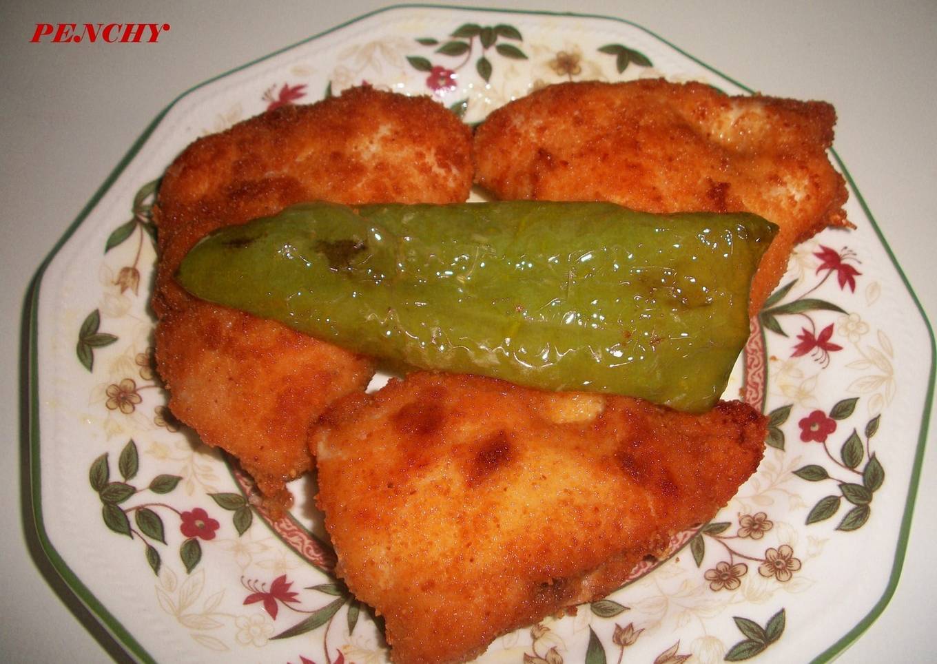 Pechugas de pollo cortadas a filetitos y rellenas de atún en aceite, y lonchas de queso Havarti, empanadas, fritas y supercrujientes, son deliciosas, a mis hijos les encantan.