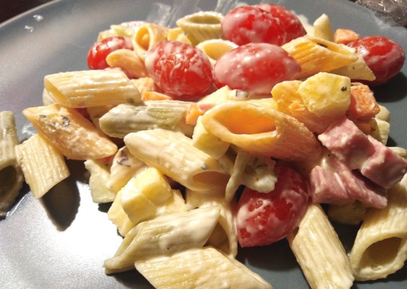 - Echar en el bol de la salsa las pasta y los demás ingredientes picados. Remover.