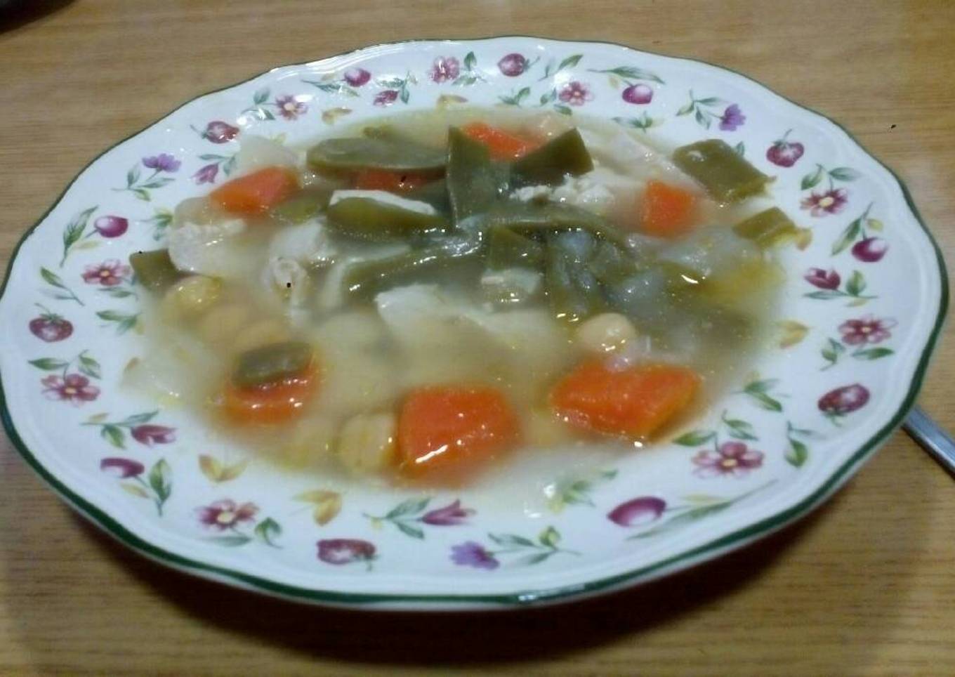- En una ollita pequeña ponemos dos vasos de agua o tres,se pone al fuego con la cucharada de aceite y un pelin de sal ,la pechuga de pollo a trozitos,la zanahoria a trozitos,la cebolla a trozitos,las judias a trozitos y a hervir media horita mas o menos.