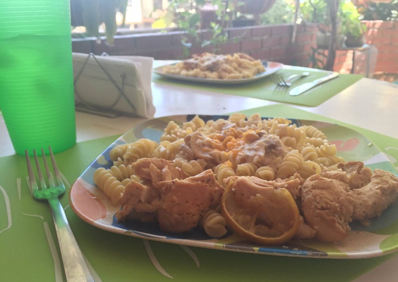 Pasta con pollo al limón, con salsa de yogurt griego.