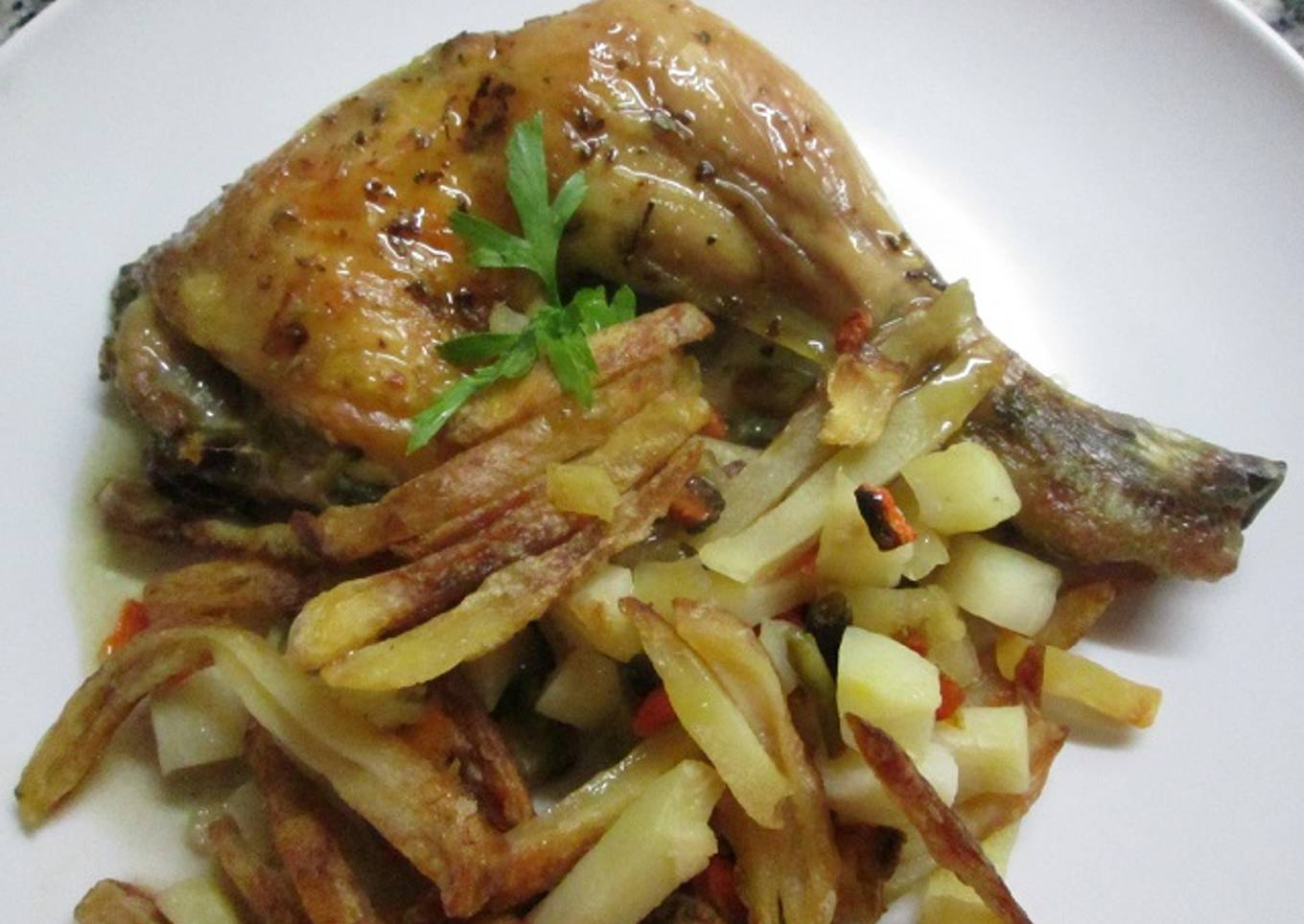 - Servir las presas de pollo con la guarnición combinada de patatas y ensaladilla horneadas.