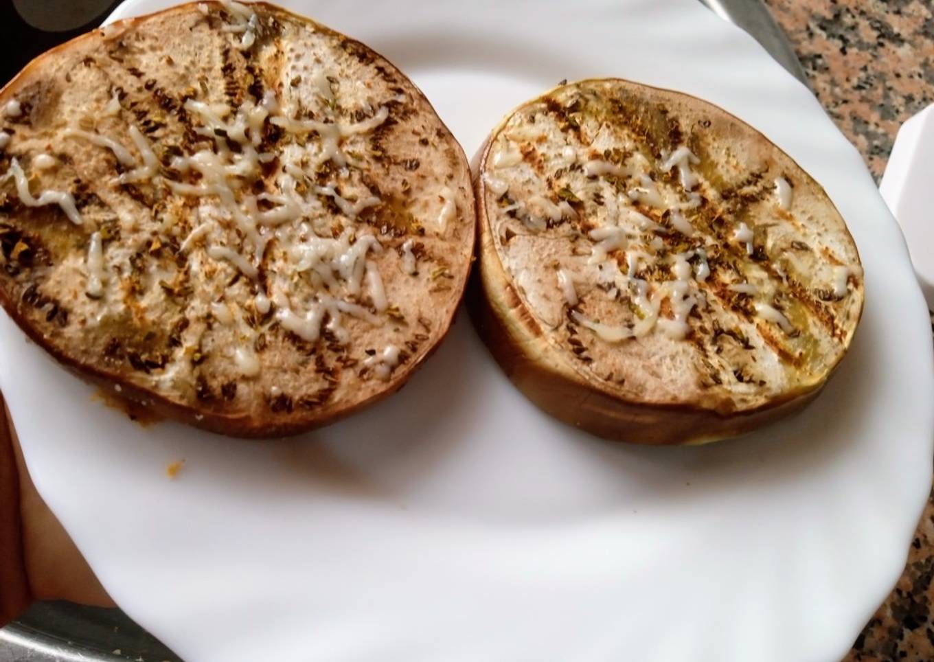 - Lavamos y cortamos la berenjena en rodajas de un cm de grosor