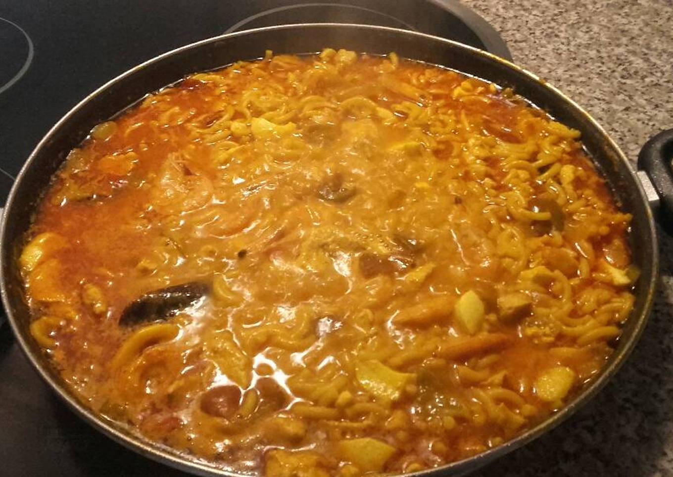 - Pochar el pimiento rojo y verde.el ajo cebolla.luego hacemos raritos el pollo y lo pasamos por la turmi con los impuestos ajo cebolla y dejamos repostar 10 minutos comemos la papelera y echamos un chorro de aceite y echamos los fideos fidegua y dejamos 3 minutos y luego echamos el caldo y el yogur natural y dejamos a Diego lente 15 minutos después echamos el preparado de paella y dejamos que el caldo de consuma y listo dejamos repostar y a comer ecamo un vaso de leche irviendo después de que se consuma el caldo
