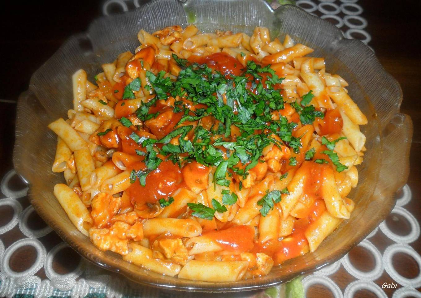 Macarrones con pollo y champiñones al tomate