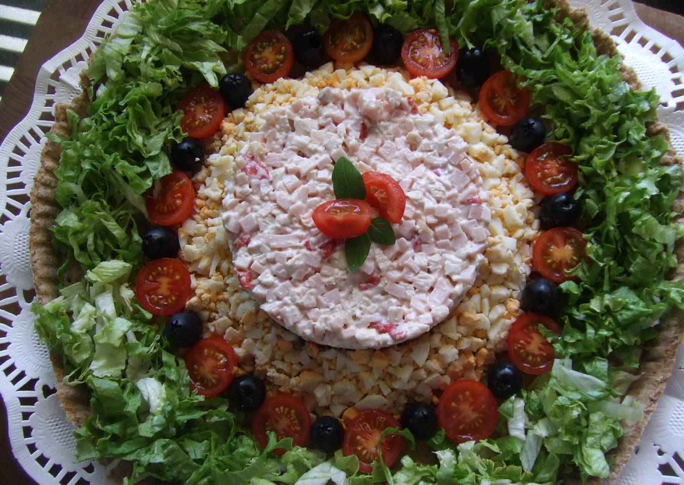 - Lo rodeamos con el huevo, luego con la lechuga y entre estos dos ingredientes colocamos los tomates alternándolos con las aceitunas.