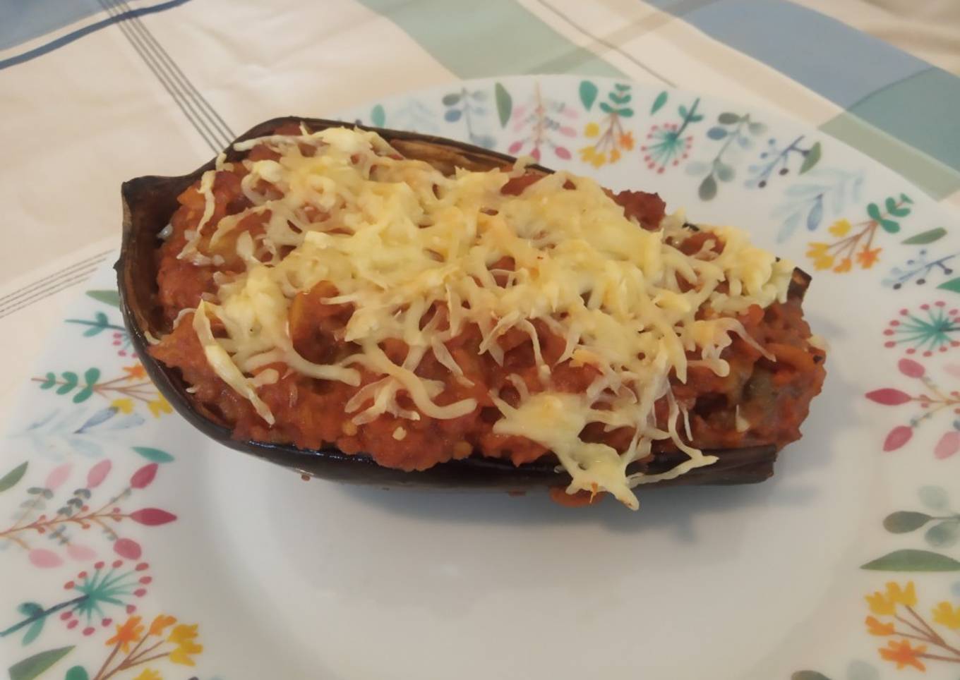 - Sacamos las berenjenas del horno, las rellenamos, le echamos queso rallado por encima y lo volvemos a meter al horno con el grill superior para que se derrita el queso
