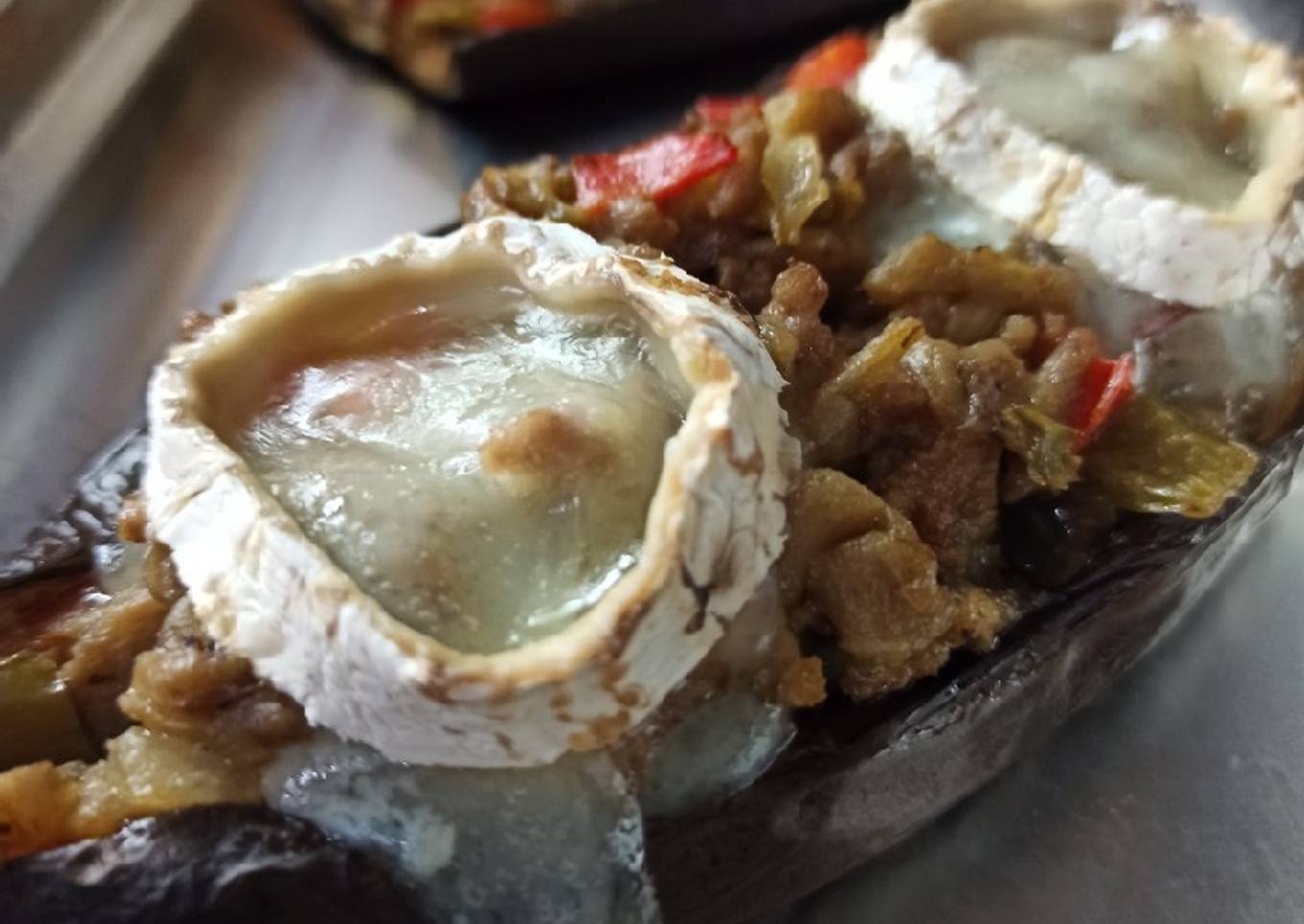 - Cuando esté listo, rellenamos las berenjenas y ponemos dos trozos de unos 7-8mm de queso de cabra encima de cada berenjena.