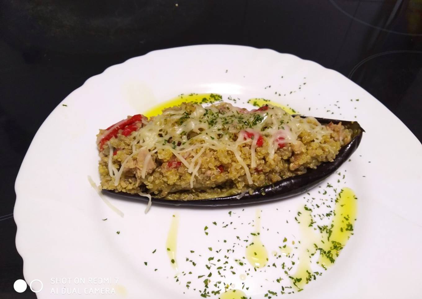- Se deja enfriar la quinoa en un cuenco se mezclan el atún el pimiento morrón cortado a trocitos la carne de la berenjena la quinoa se echa sal orégano cilantro se mezcla todo se rellenan las berenjenas se pone encima queso rallado un poco de aceite se pone en grill de microondas durante 6 minutos y listo 😜😋