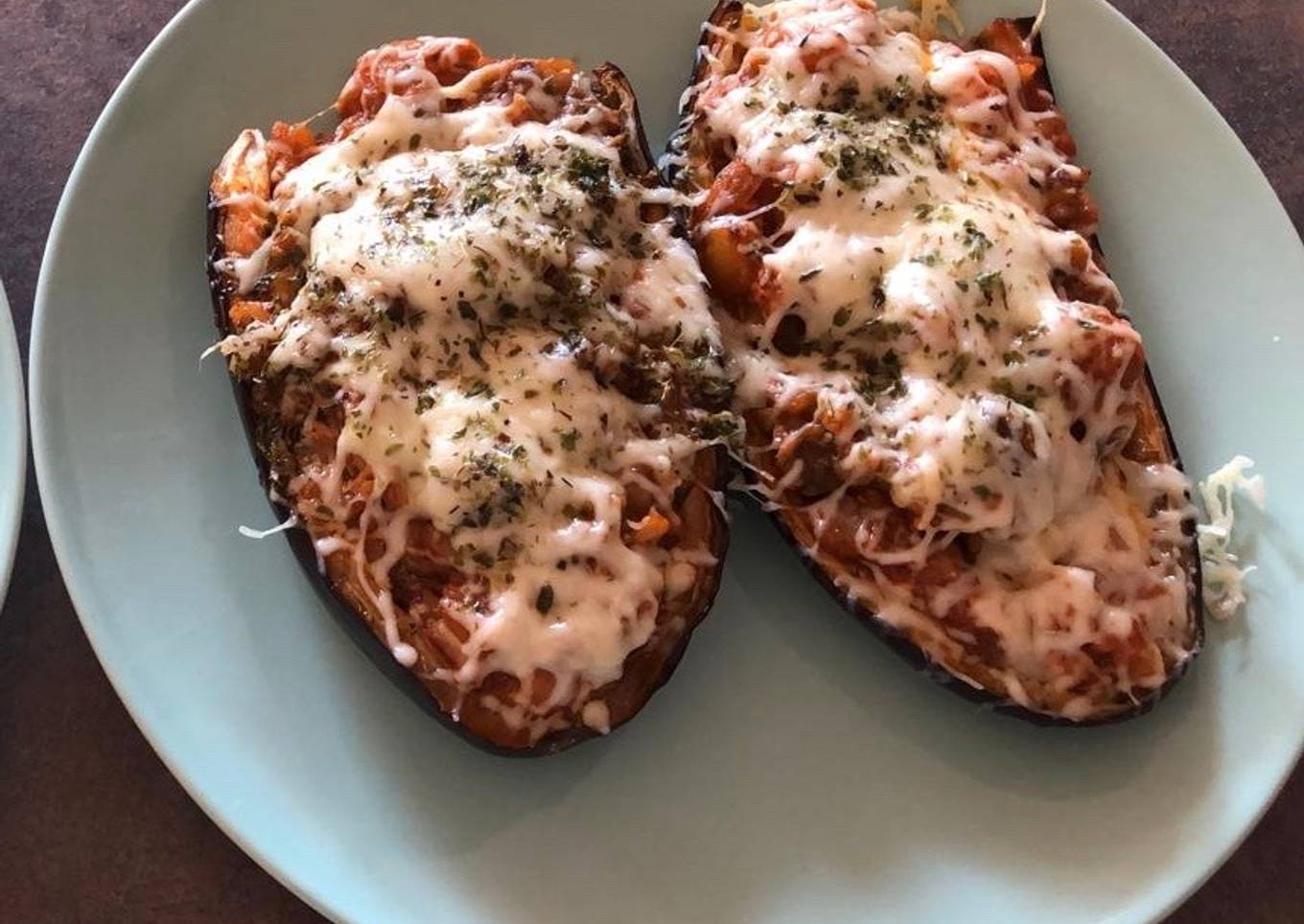 - Rellenamos las bases de las berenjenas, echamos el queso y orégano por encima. 10 minutos al horno a 180 grados.