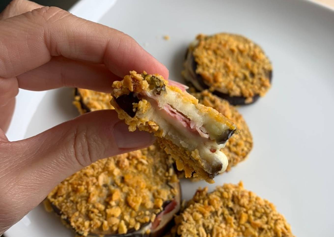 Bocaditos crujientes de berenjena al horno rellenos de jamón y queso