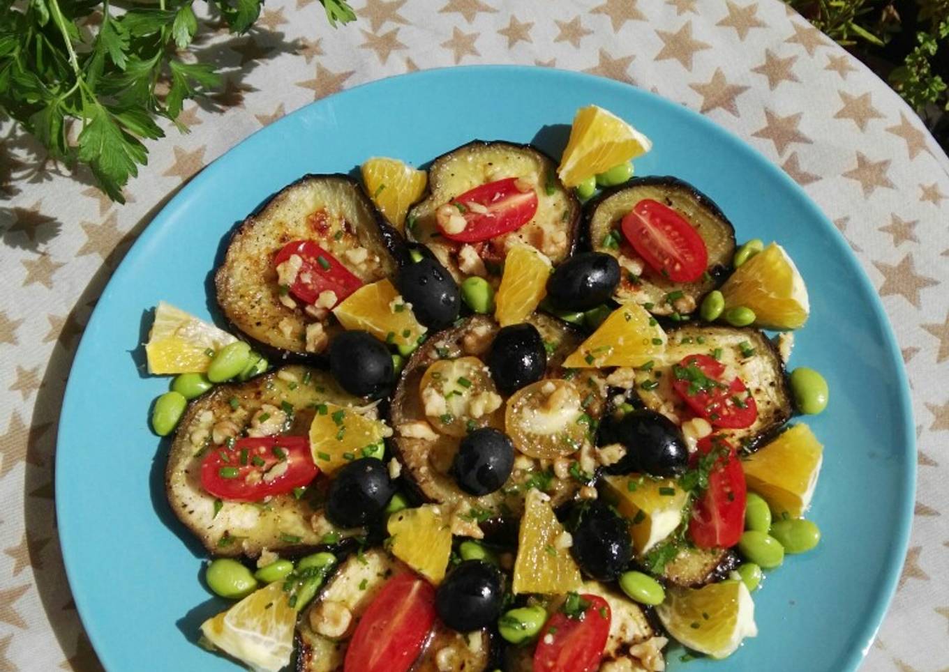 Ensalada de berenjena y edemame con vinagreta de naranja