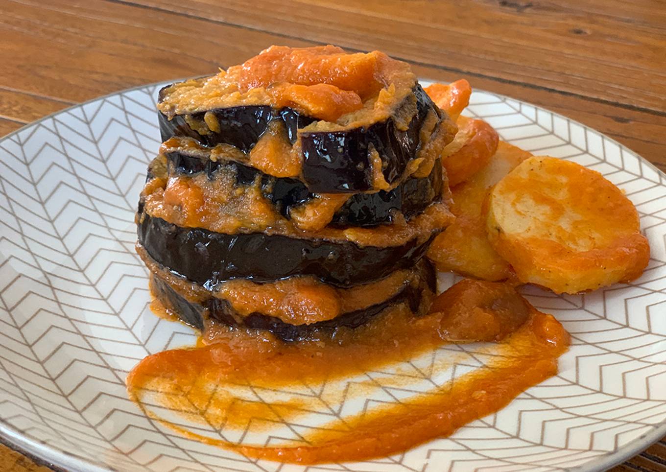 - Y montamos el plato alternando berenjenas y setas. Acompañamos con las patatas y salsa Y a comer! Comparte si te ha gustado y, si lo haces, sube la foto!!