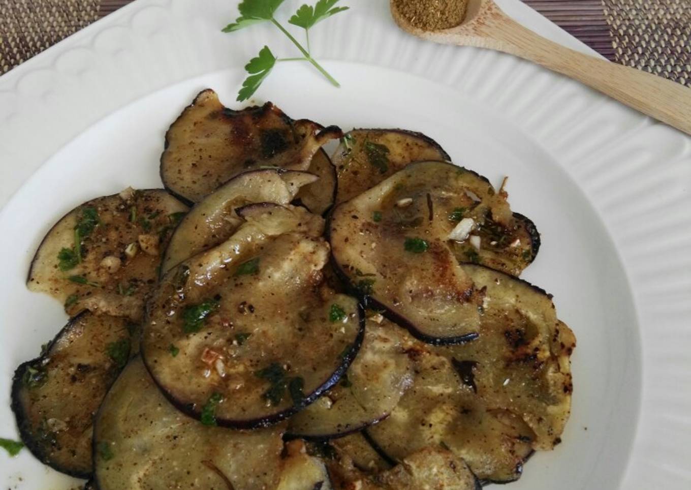 - Secar un poco las rodajas de berenjena, poner una capa en una fuente y pintar con el marinado. Encima poner un poco de sal, pimienta negra molida y perejil fresco picado. Repetir capas y a la última añadir también un chorrito de AOVE