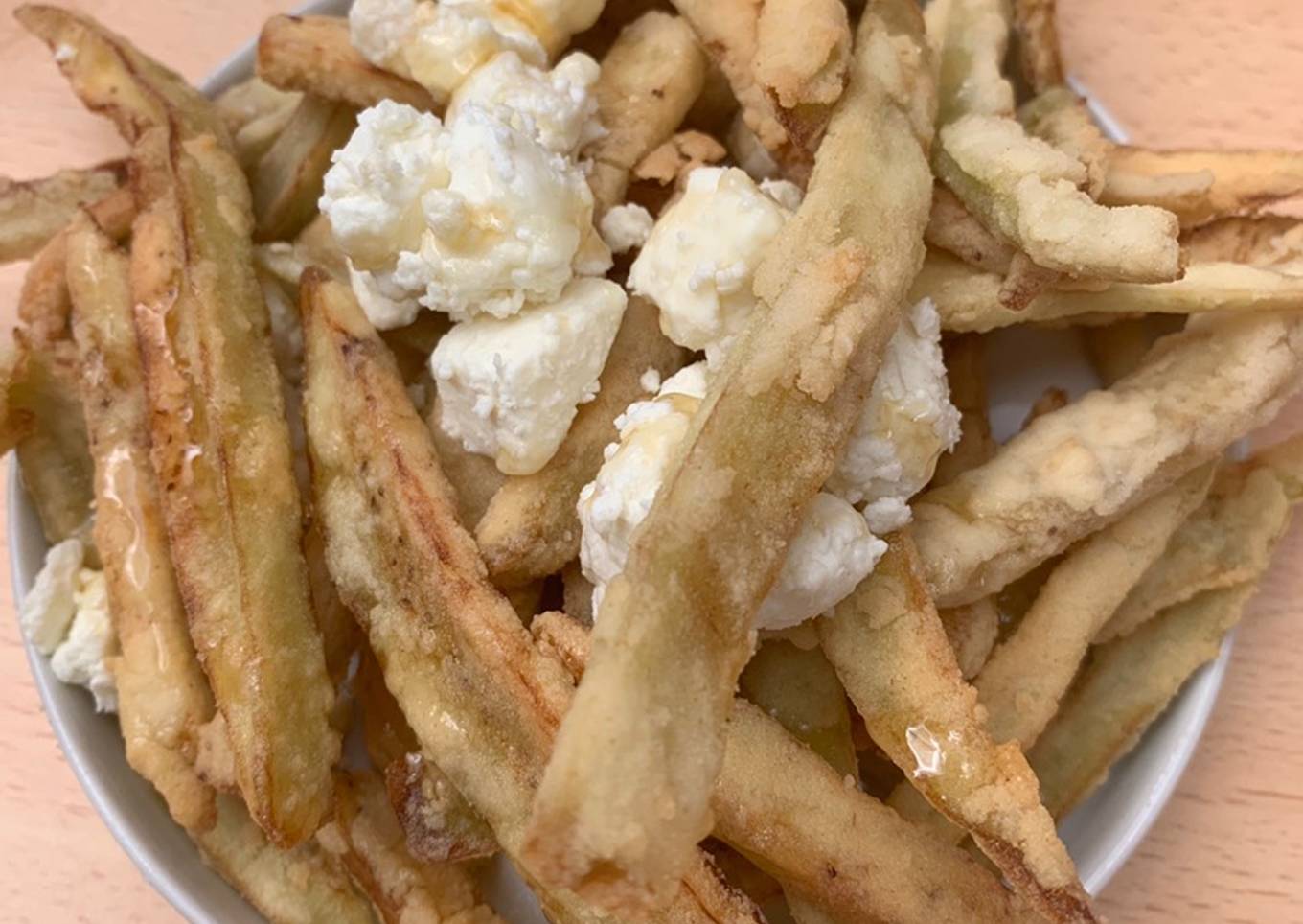 Mojas cada bastoncillo un par de veces y fríe por tandas, sin que se amontonen y controla el aceite para que no se quemen - Las dejas escurrir en papel cocina y luego le agregas la miel y el queso de Cabra en porciones.
