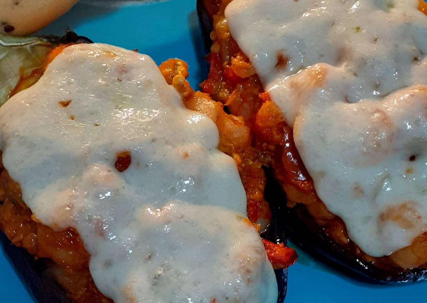 - Rellenar las berenjenas con el relleno de la sartén, poner queso por encima y gratinar en el horno.