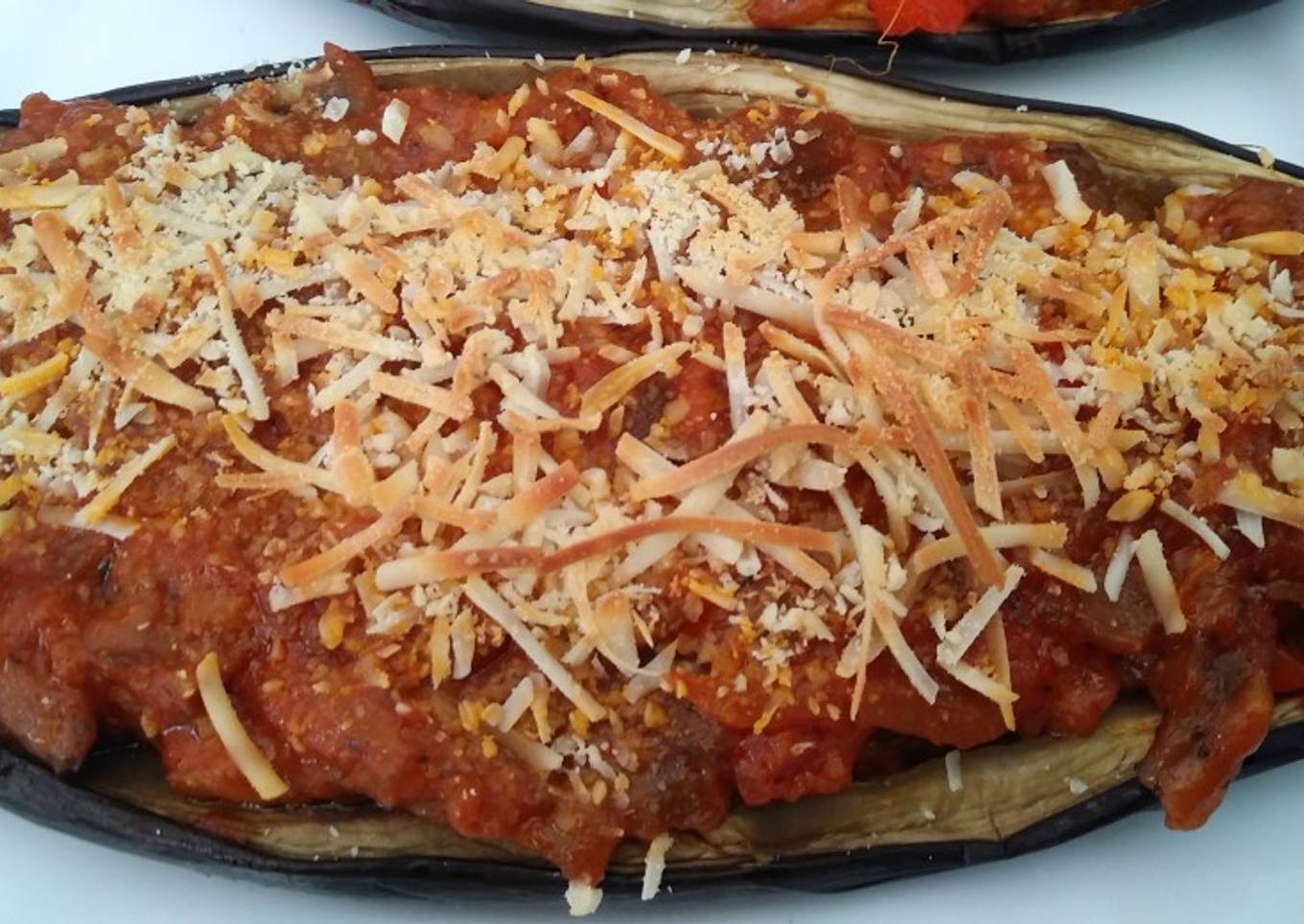 - Rellenar las berenjenas con el preparado anterior, añadir el queso rallado por encima y gratinar en el horno