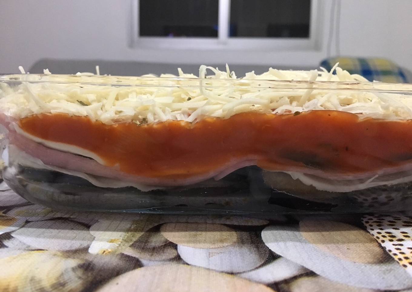 - 1.las berenjenas 2 queso loncha, 3 jamón York y así vas montando todas las veces que quieras