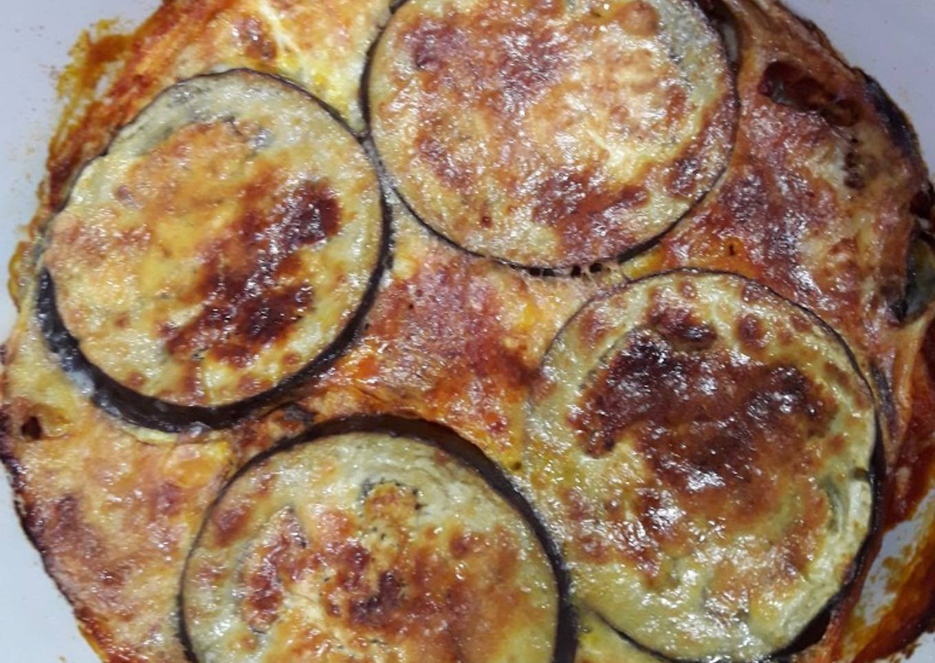 - Acabar con una capa de berenjena, cubrir con el huevo batido y terminar con una capa de queso rallado.