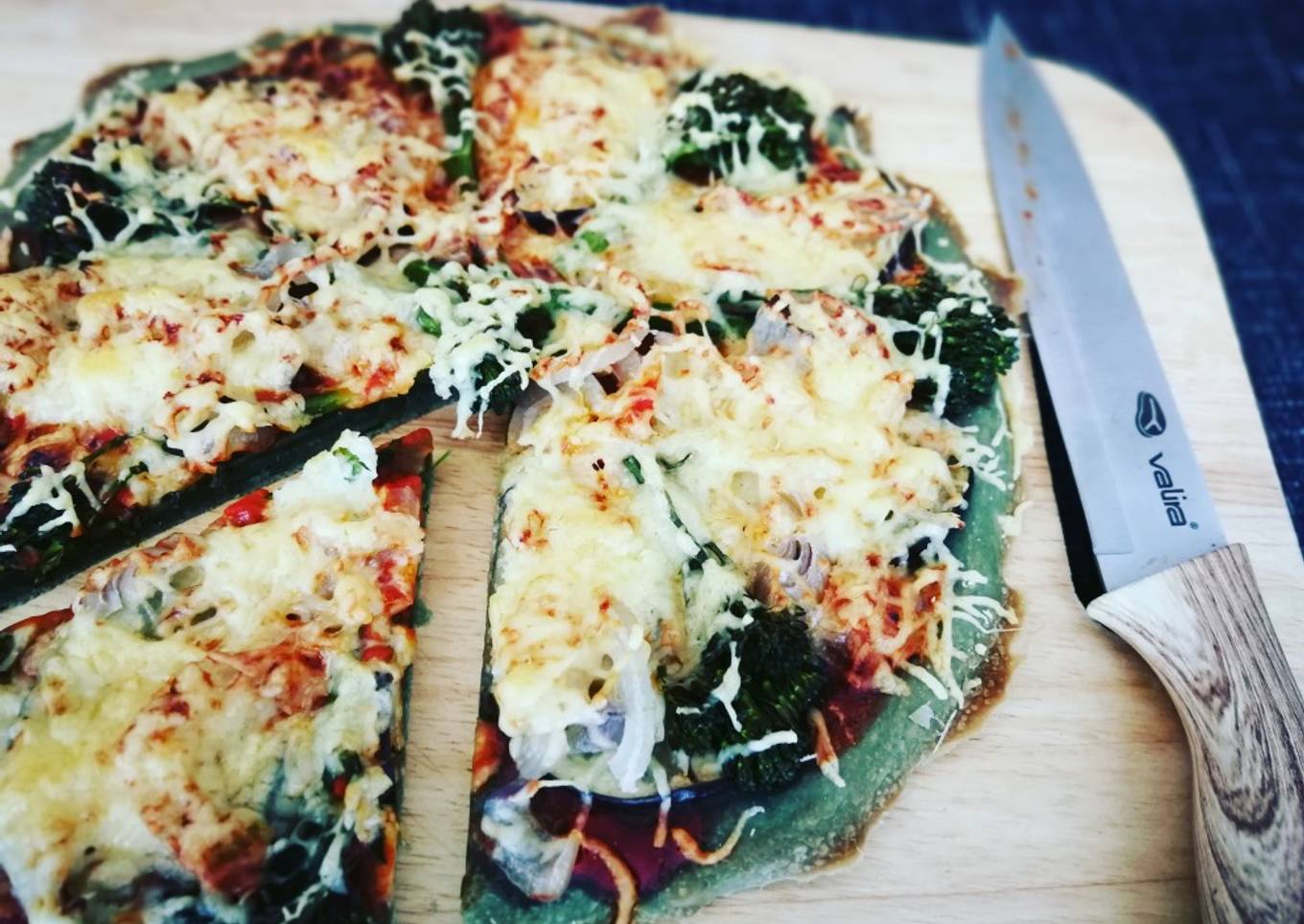 - Coloca la harina, la alga espirulina en polvo, la levadura seca, el aceite de oliva virgen extra, una pizca sal, el azúcar moreno integral y el agua. Deja batir 10 minutos la masa. Extender la masa en una bandeja apta para el horno, con los dedos engrasado con aceite y dejar reposar 30 minutos.