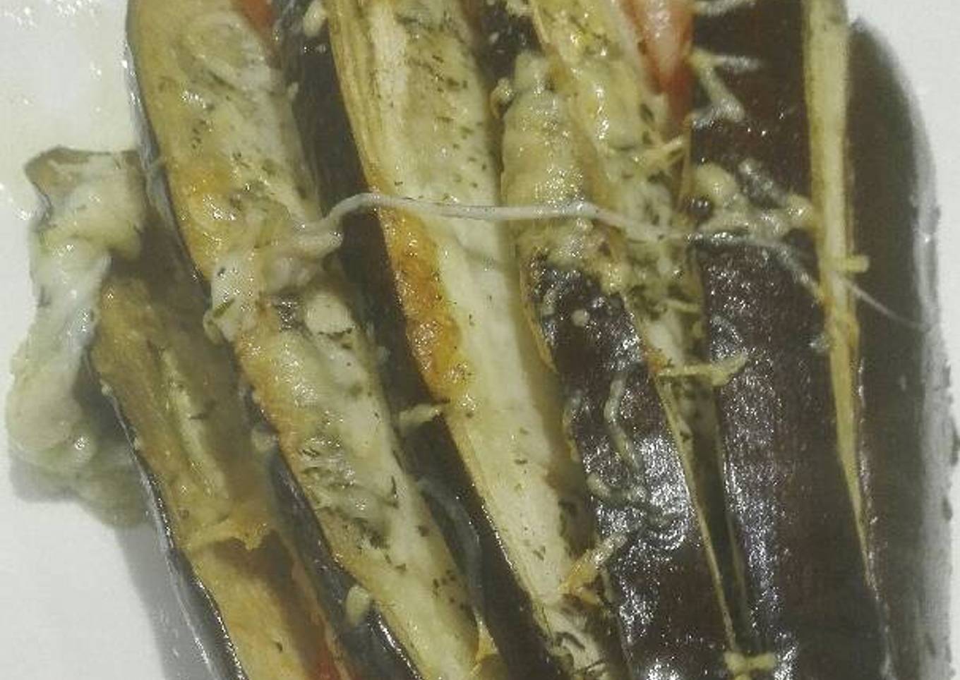 - Con un cuchillo cortar la berenjena a láminas, pero sin cortarla del todo.