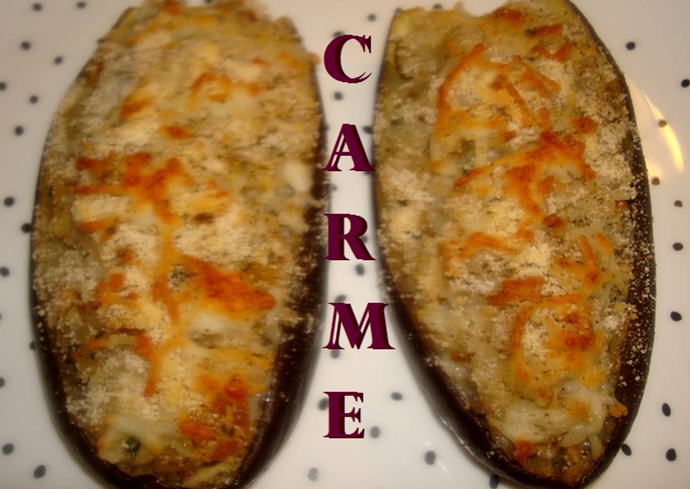 Las berenjenas son muy saludables y se recomienda su consumo con frecuencia. En esta ocasión las he hecho vegetarianas, las he rellenado con arroz hervido que me sobró ayer de otra preparación, nueces partidas, orejones de albaricoque, alcaparras y queso rallado.