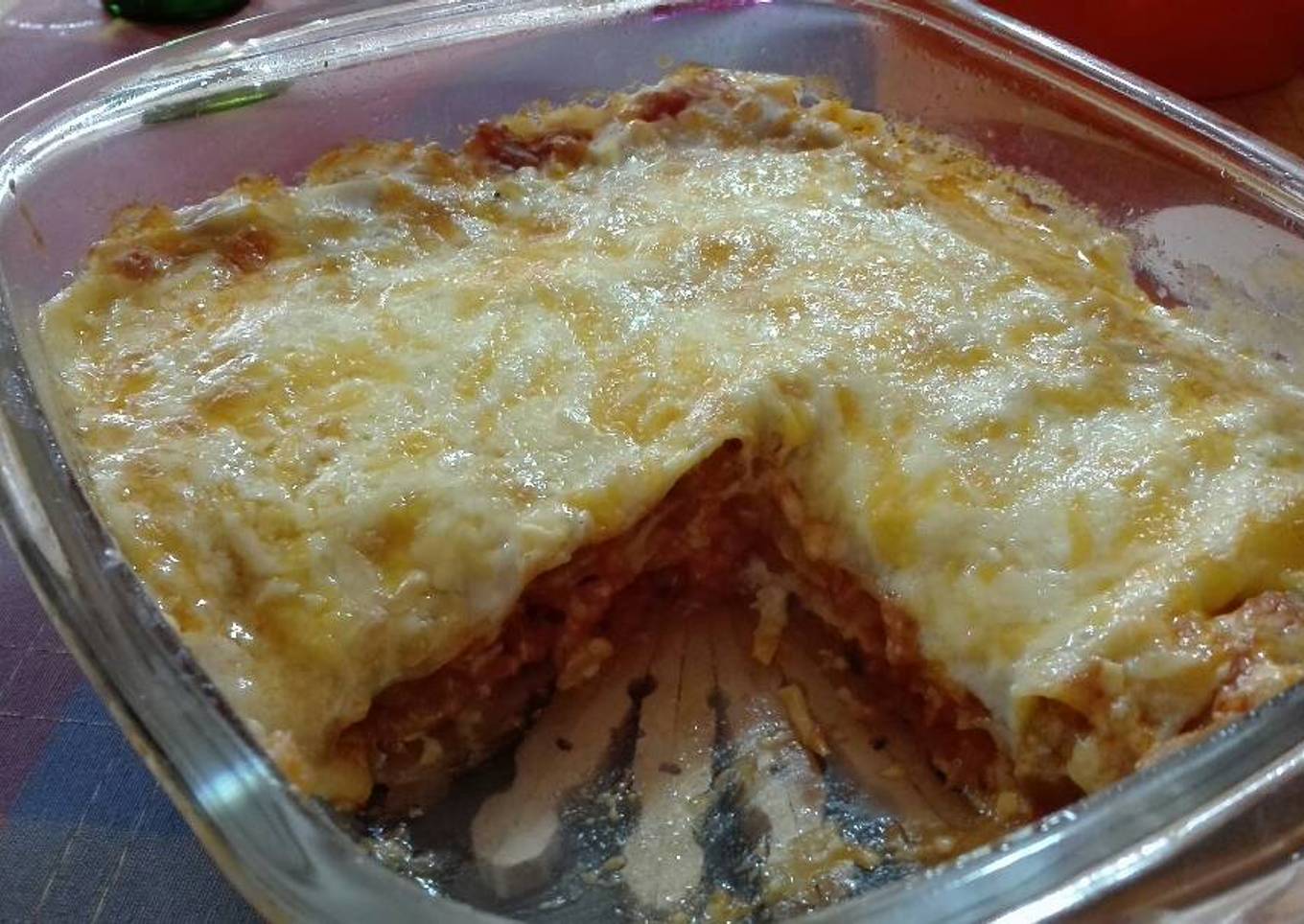 - Después de 40 minutos, sacamos el recipiente y quitamos el papel de plata. Cubrimos la lasaña de queso rallado.