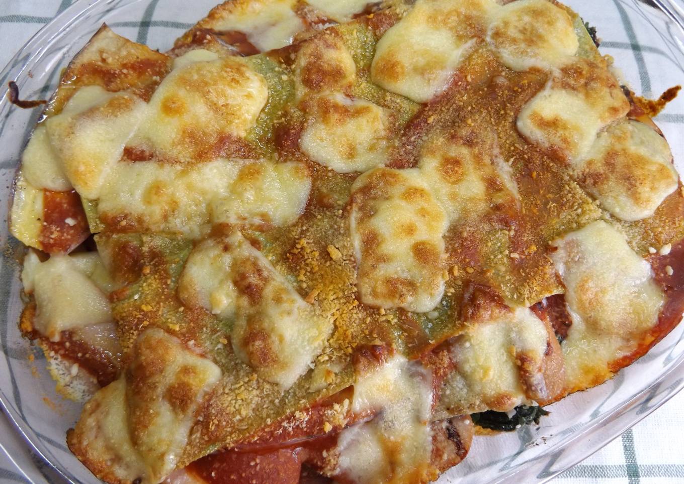 - En el fondo de una fuente poner un chorretón de salsa, una placa de lasaña, un buen chorretón de salsa, una capa de berenjena y una de salchichas. Espolvorear con trocitos de queso cheddar. Otra placa de masa, más salsa, las espinacas bien distribuidas, más queso cheddar y salchichas. Y así hasta terminar con todos los ingredientes. Terminar con una placa de masa, salsa y quesos. Llevar a horno precalentado a 200ºC durante unos 35 minutos o hasta que esté dorada y caliente.