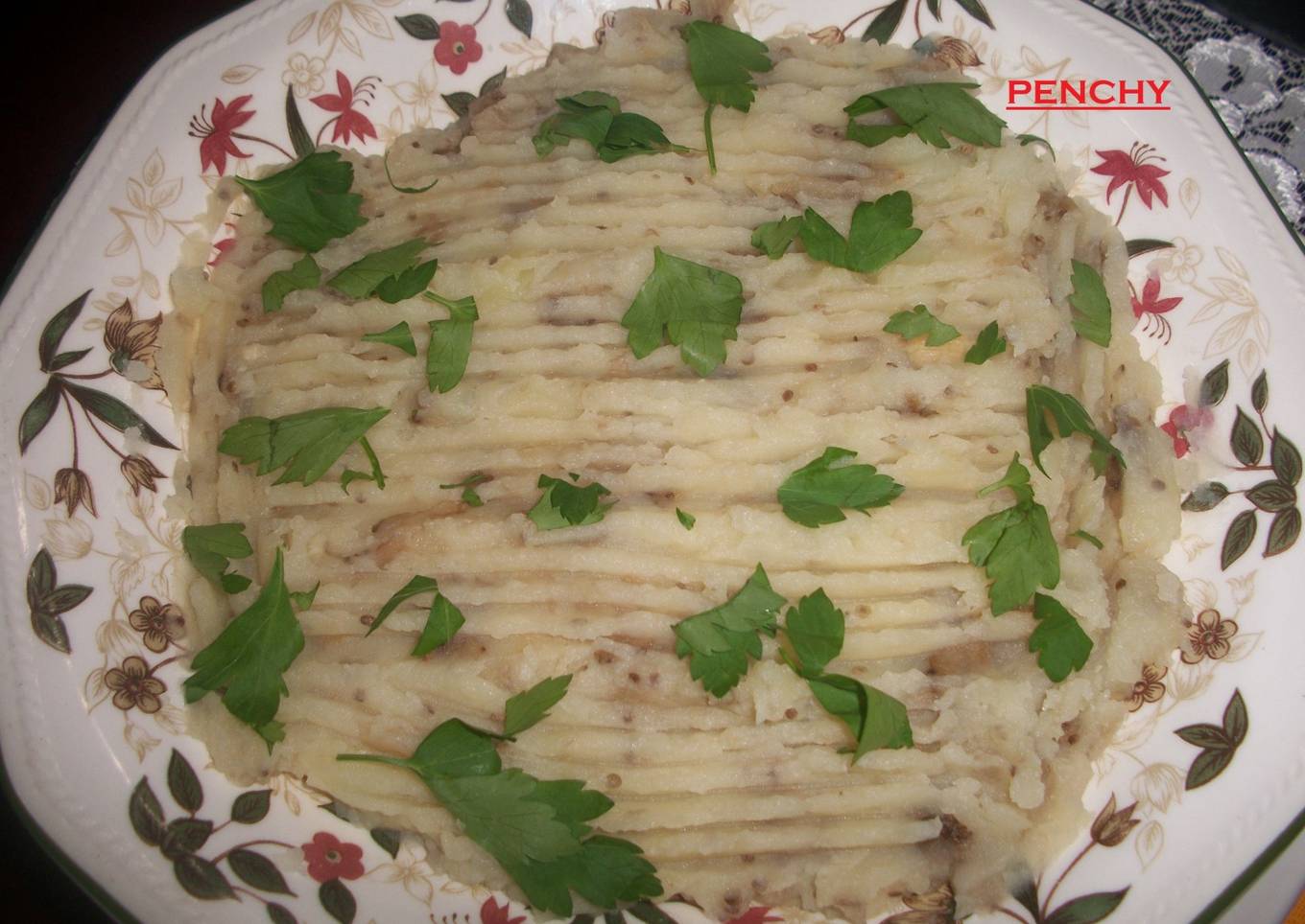 - Rehogamos un par de minutos y añadimos el puré de patata, un poco de sal y 2 cucharadas de aceite de oliva, mezclamos bien y volcamos en una fuente, espolvoreamos con el perejil picado y servimos inmediatamente.