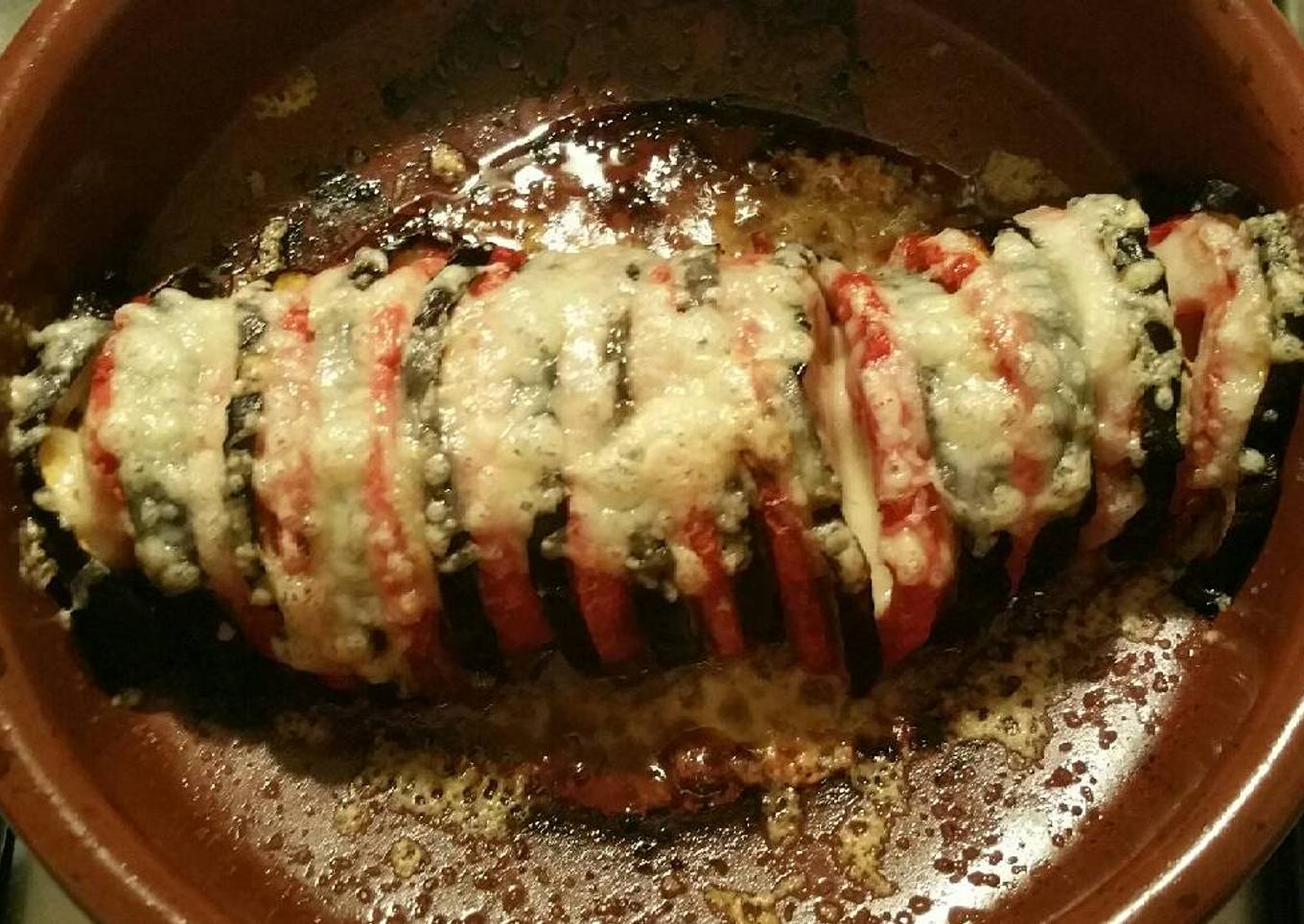 Rollo de berenjena, tomate y queso gratinado