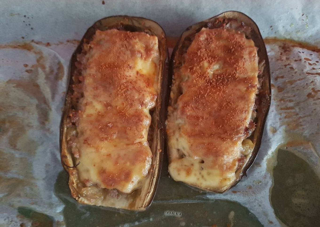 - En papel de horno colocar las mitades de berenjena y rellenar con la mezcla de carne picada y berenjena