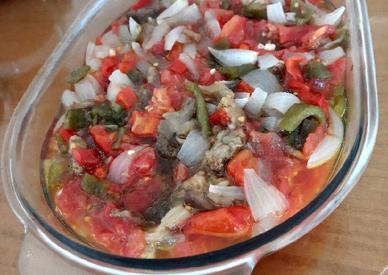- Se asan en el horno la berenjena 🍆, los pimientos, y la cebolla a unos 180 grados hasta que estén dorados.