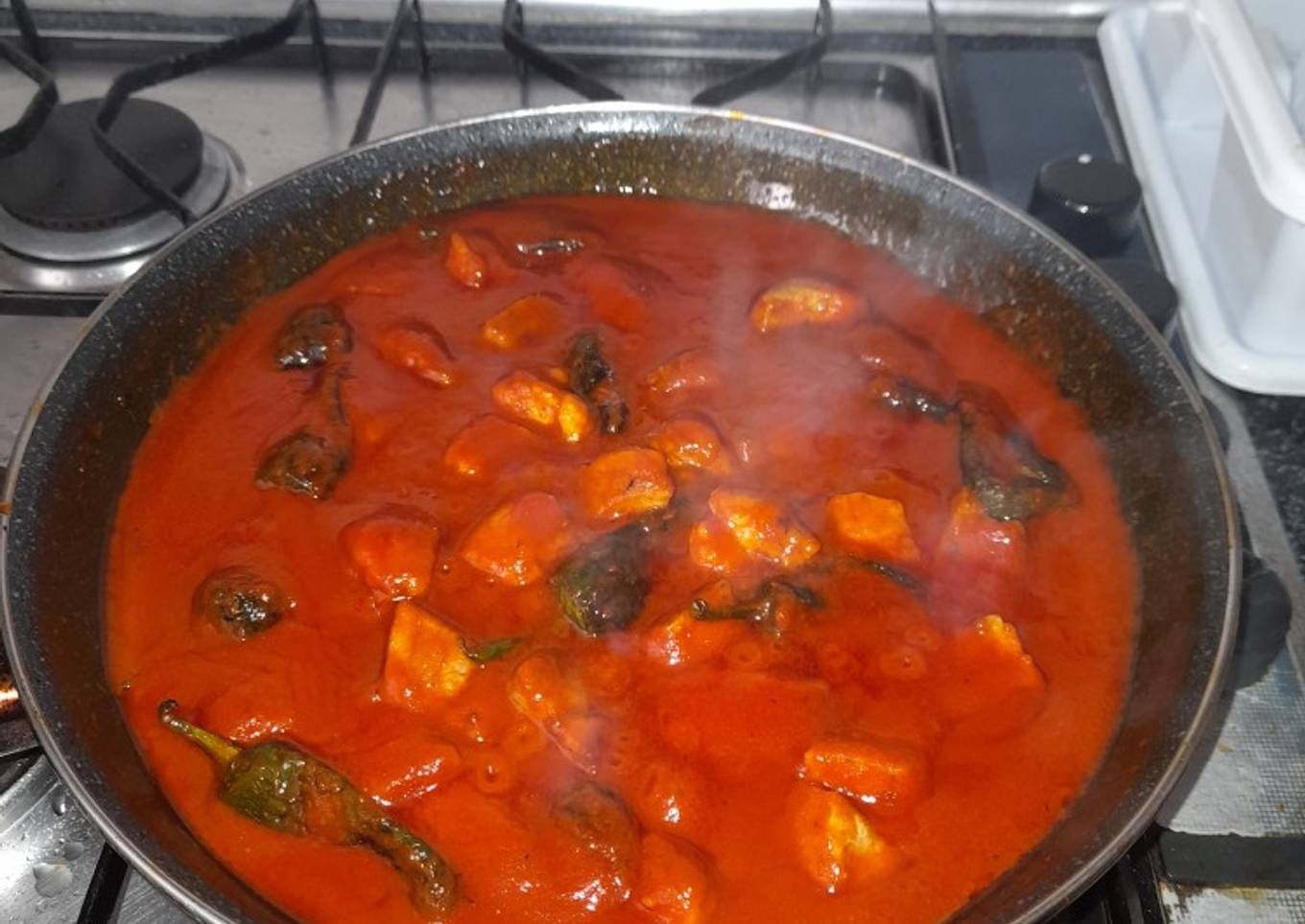 - Escalfamos el tomate en agua hirviendo lo pelamos, trituramos y fre铆mos con una cucharada de aceite de oliva virgen, sal y az煤car en la misma proporci贸n en una sart茅n grande durante aproximadamente. 20 min y mientras hacemos la Magra.