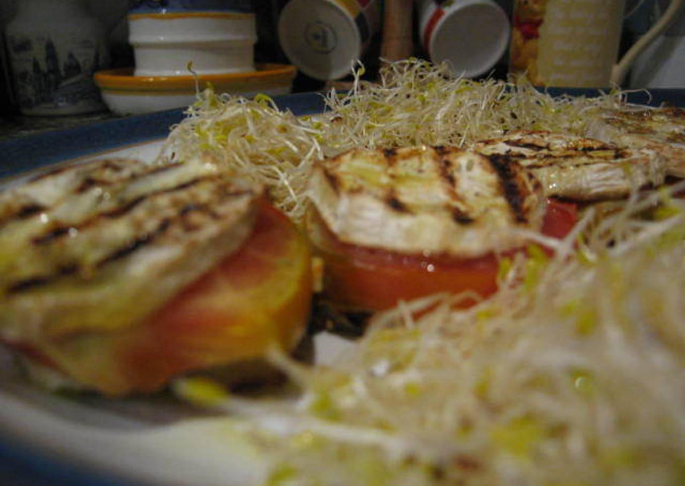 - Se calienta la plancha y se hacen las rodajas de berenjena, previamente aliñadas con sal, pimienta y zumo de limón
