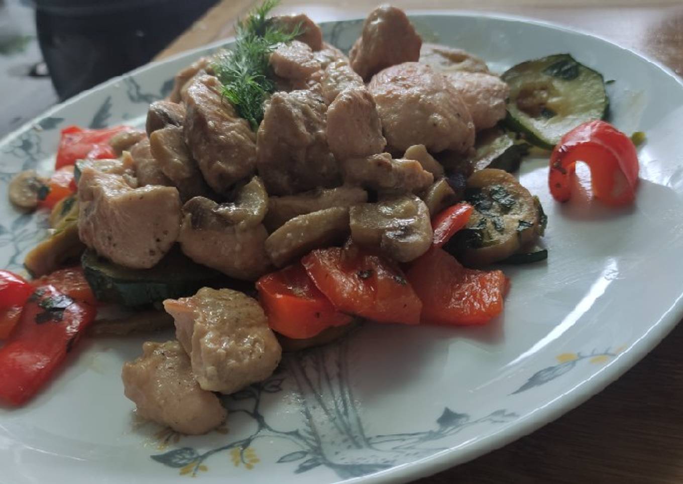 Muslo deshuesado de pollo con verduras y salsa de leche de coco